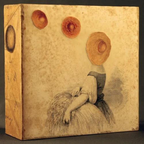 These encaustic collages employ a mix of beeswax and damar resin to bind and seal the images to the wood, paper, or vintage book covers used here. All were created between 2005 - 2010.